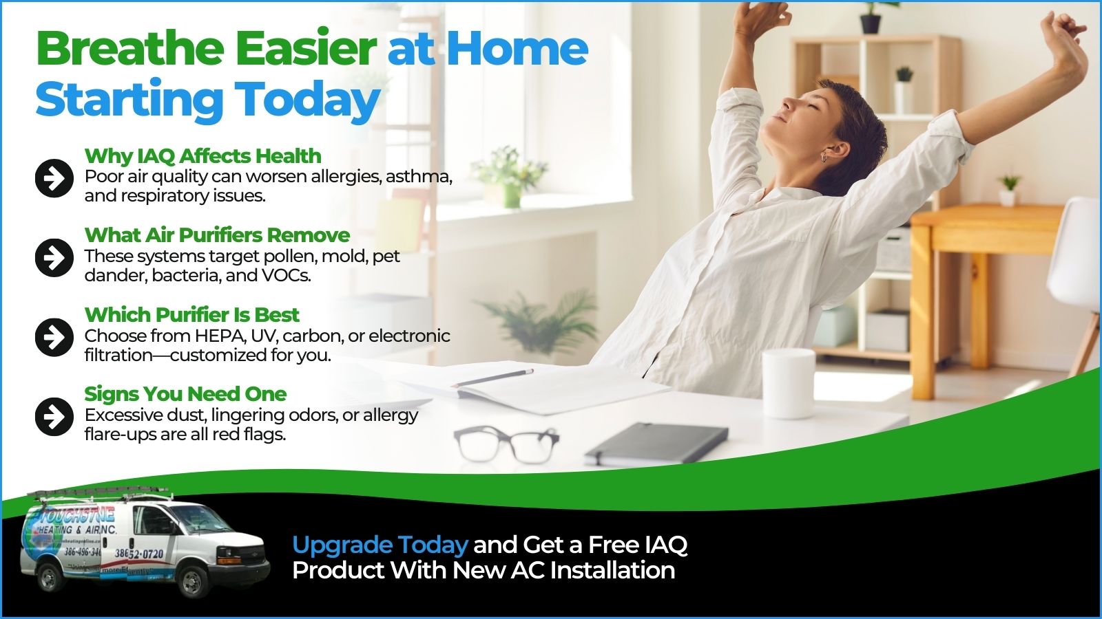 We offer advanced air purification systems designed to clean your indoor air and create a healthier home environment. Keep reading to learn how an air purifier can dramatically improve your indoor air quality and why it’s a smart investment for your family. Now’s the perfect time to upgrade! Purchase a new high-efficiency AC and get a FREE indoor air quality (IAQ) product, customizable to fit your needs.